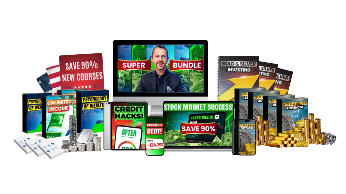 5 Courses: Stock Market Program, Gold & Silver Investing, Gold & Silver Advanced, Rapid Cashflow, Psychology Of Wealth + 2 FREE Courses: Credit Hacks & Debt Annihilation